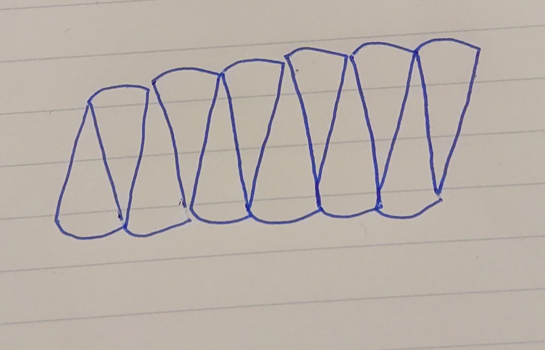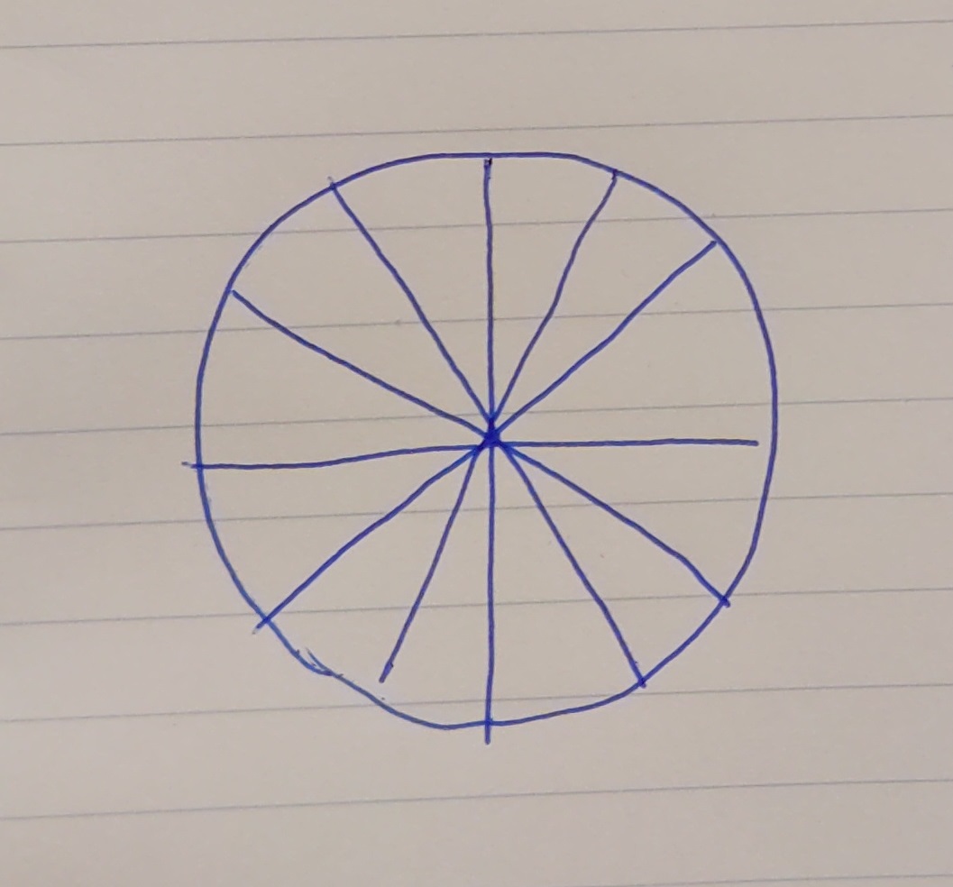 どこに疑問を抱いたかと言いますと、この証明には扇形の面積の公式が用いられているところです。つまり、円の面積の公式が用いられているわけです。しかし、私は円の面積の公式は、小学校で習っただけで、そこからアップデートはされていなかったわけです。そして、小学校の時代にどのように円の面積の公式を納得させられてきたかと言いますと、以下のような絵を描いて納得させられて来たのです。