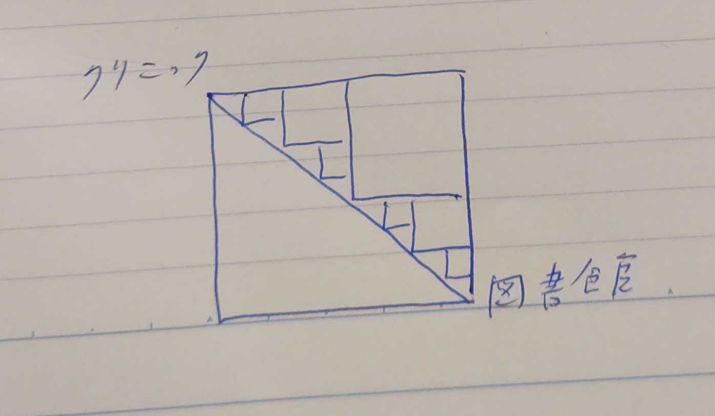ある図形の極限がある線分に近づいても、長さまで近づかない例を挙げますね。以下の図をご覧ください。1辺が1kmの正方形です。私の住んでいる町の地図です。このあたりは町全体がいわゆる「碁盤の目」のような道になっています。この右下に図書館があり、左上にクリニックがあります。大通りを行けば2kmの道のりです。これを、図のように、近道をしようとしてジグザグに歩きますと、経路はどんどん対角線に近づいていきますが、歩く道のりは2のままです。対角線の長さは${\sqrt{2}}$であるわけです。これが反例であると言えるわけです。