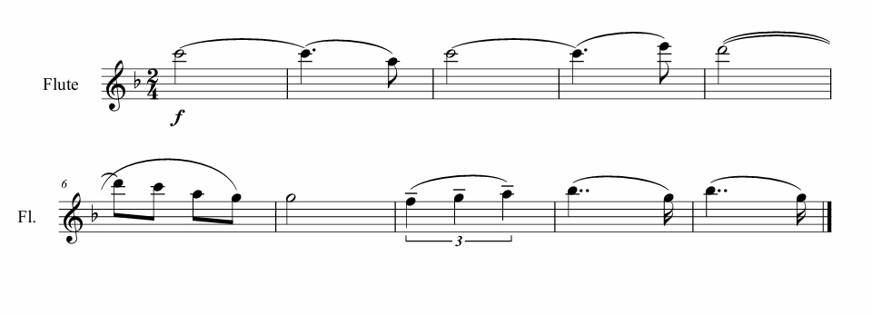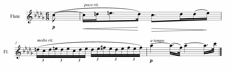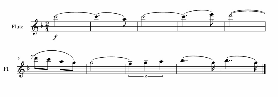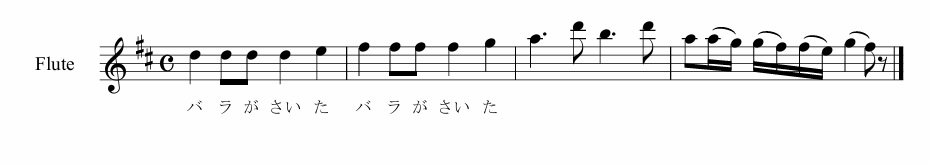 この録音を聴いていただけたらわかるのですが、冒頭の数小節は、音程が安定しません。緊張のしすぎで、音が震えていたのです。吹きながらもうひとりの自分が「また自分は緊張しているな」と笑うように思ったら一気に緊張が解け、あとはのびのびと吹けたのでした。そこで、以下の譜例をご覧ください。