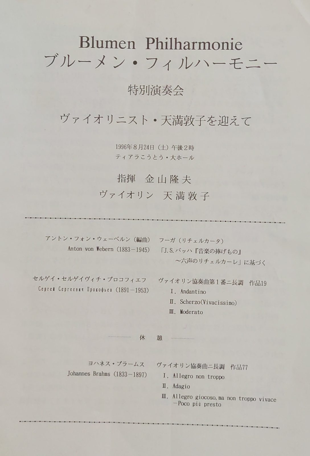 その、日記をつけ始めた最初の日である1996年8月23日に、ある東大オケのうまい先輩から、翌日の演奏会のチケットをもらっています。翌8月24日(日記をつけ始めて2日目)は、東大オケのうまい先輩を中心としたブルーメン・フィルハーモニーというアマチュア・オーケストラの演奏会だったのでした。それは以下のような演奏会であり、ヴァイオリニストの天満敦子(てんま・あつこ)さんがソリストとして登場する演奏会だったのでした。